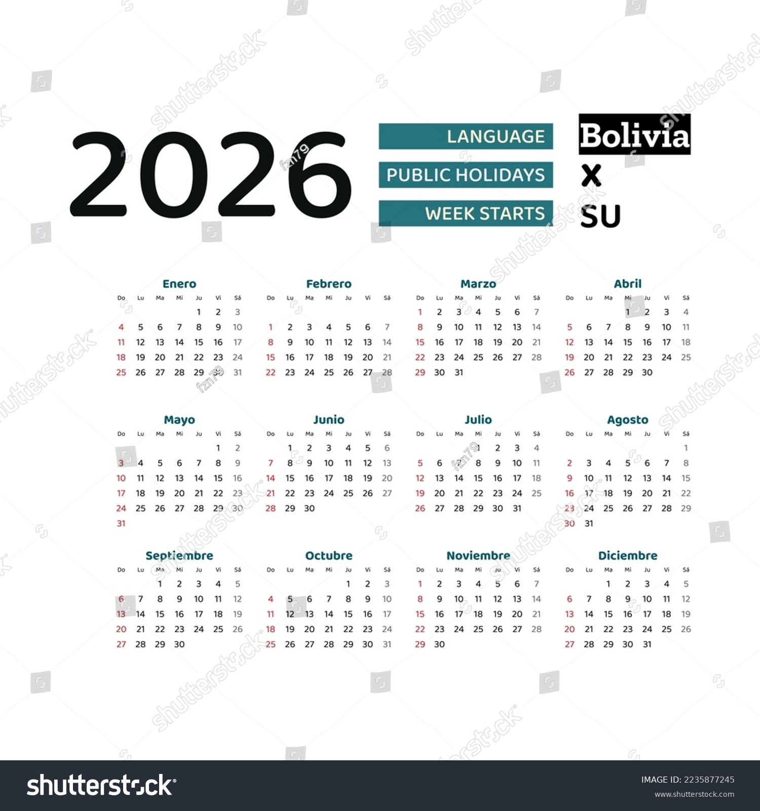 Bolivia Calendar 2026 Week Starts Sunday 2235877245 Shutterstock