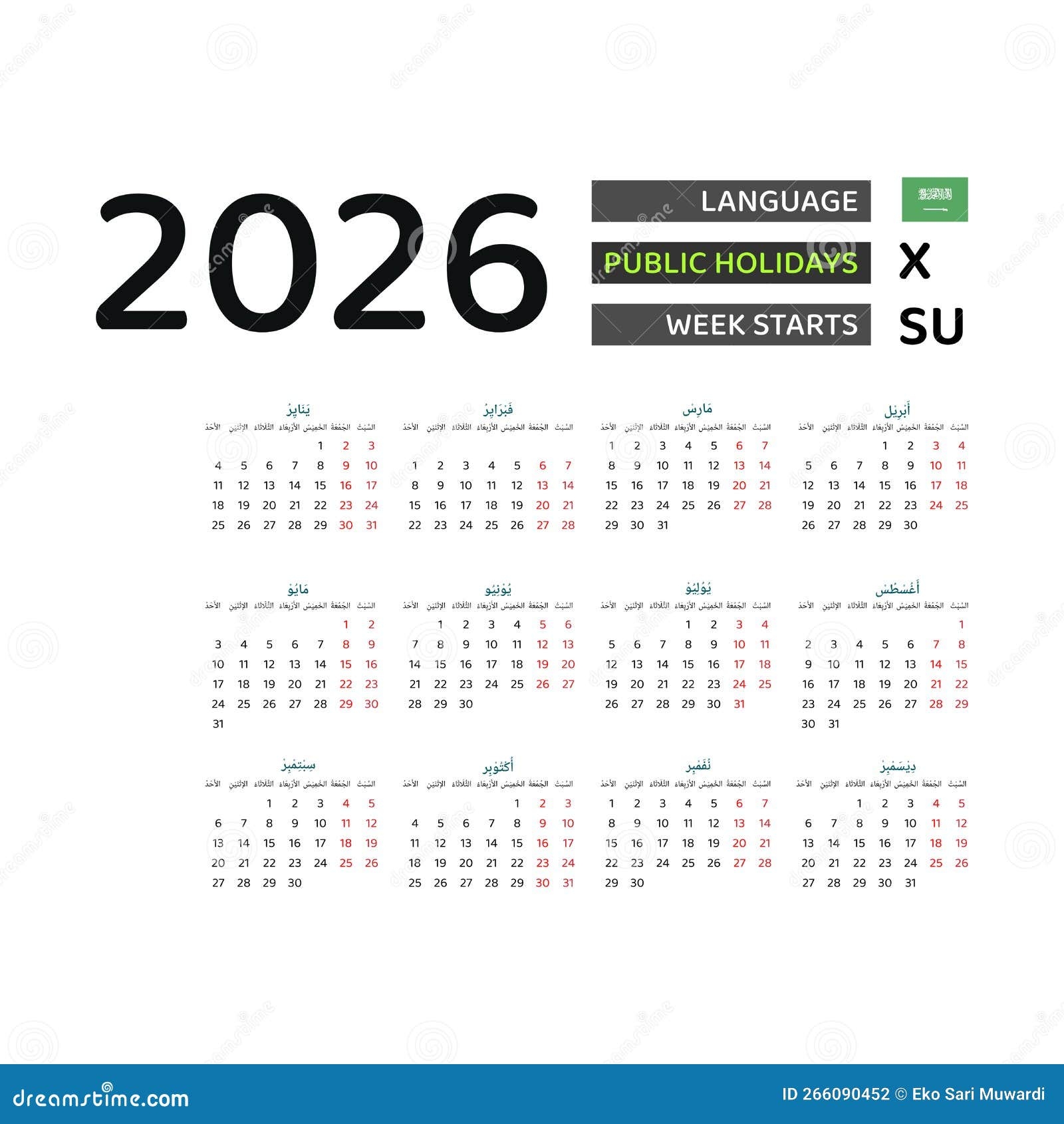 Calendar 2026 Arabic Language With Saudi Arabia Public Holidays Stock Vector Illustration Of July August 266090452