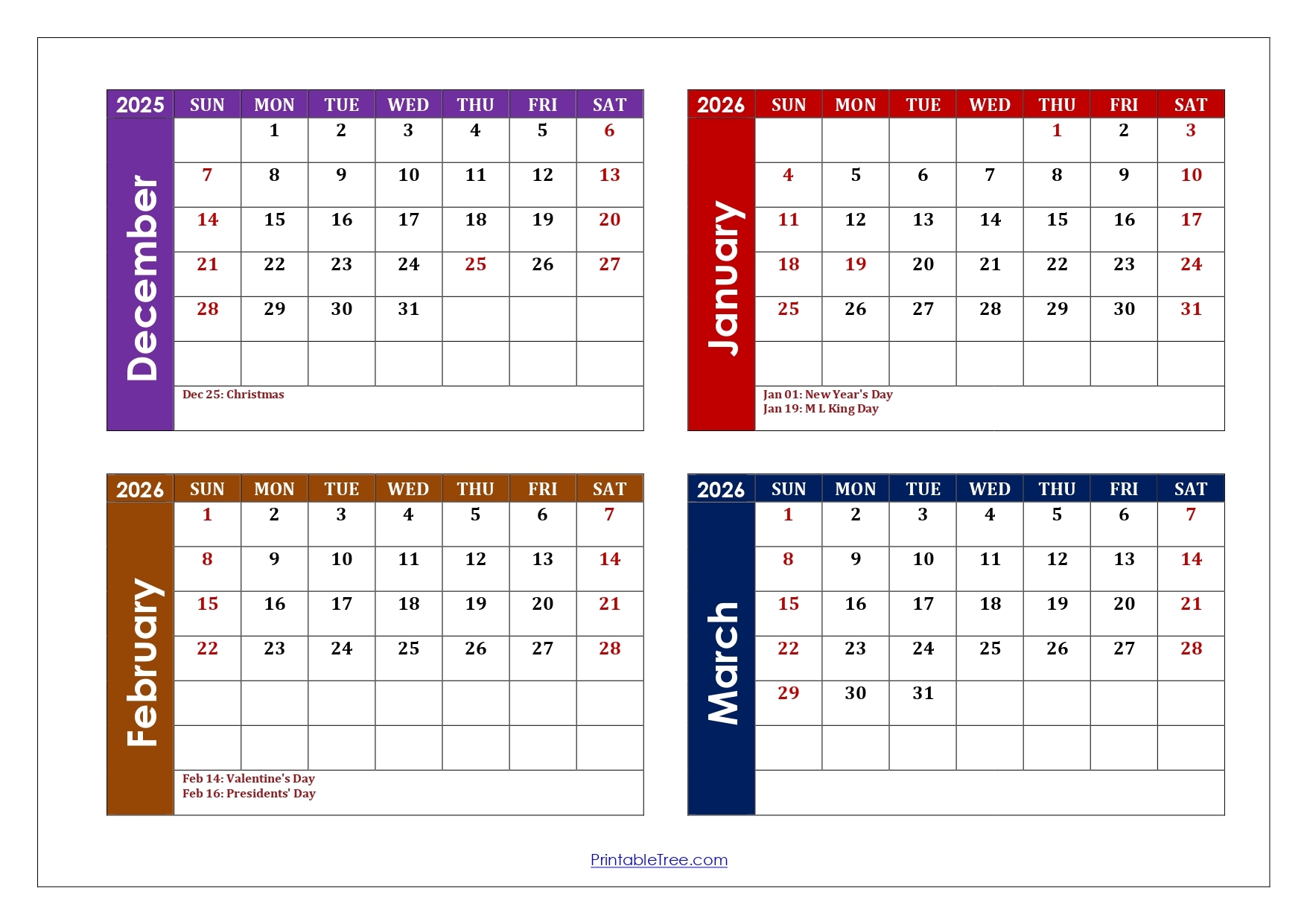December To March 2026 Calendar Printable PDF Four Months Calendar