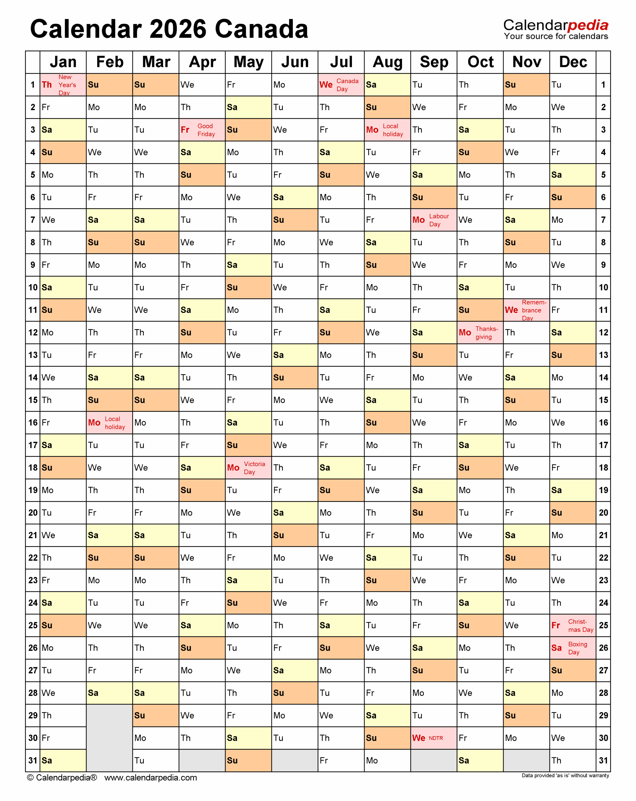 Canada Calendar 2026 Free Printable PDF Templates
