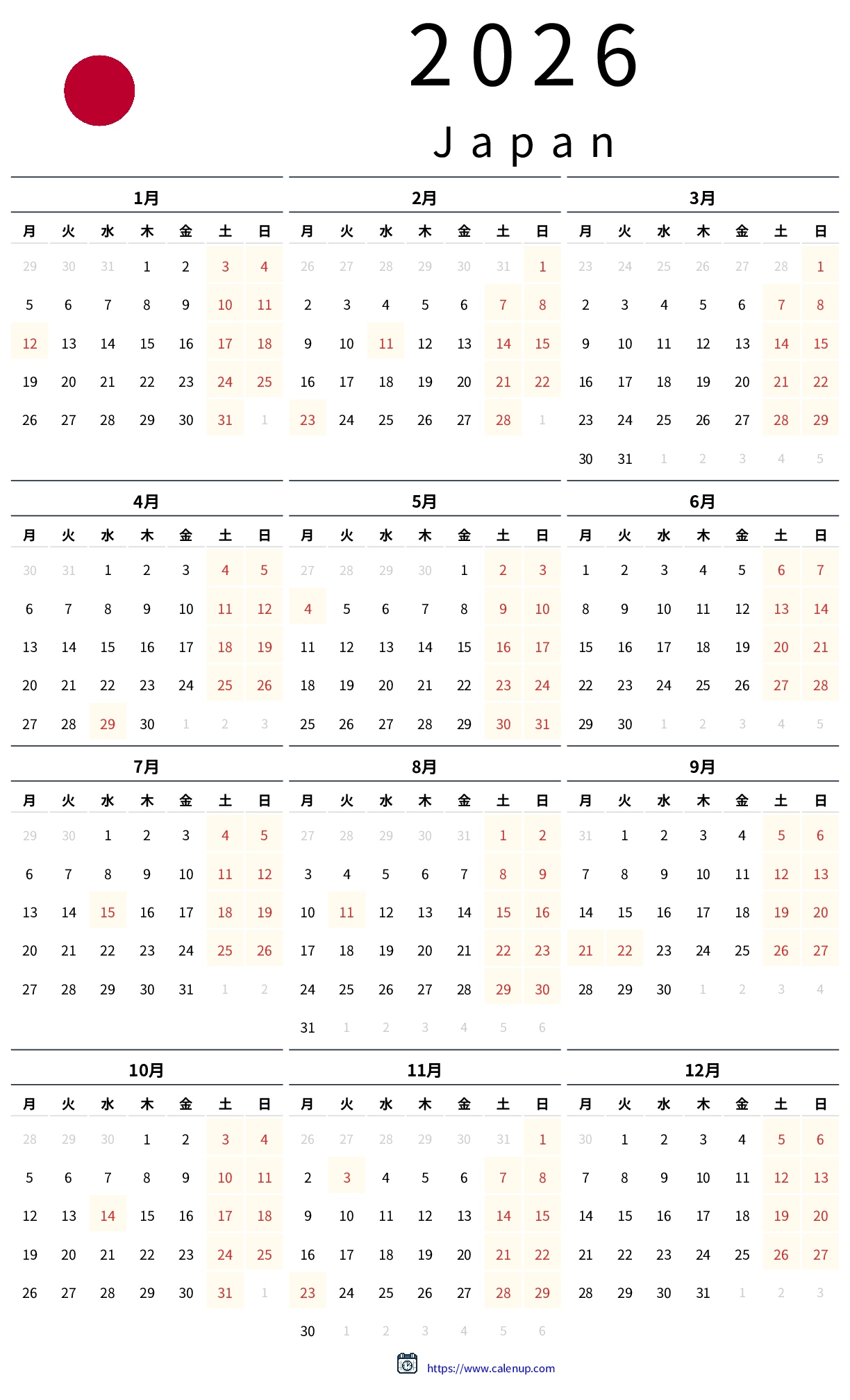 2026 Calendar Printable With Holidays For Japan CalenUP