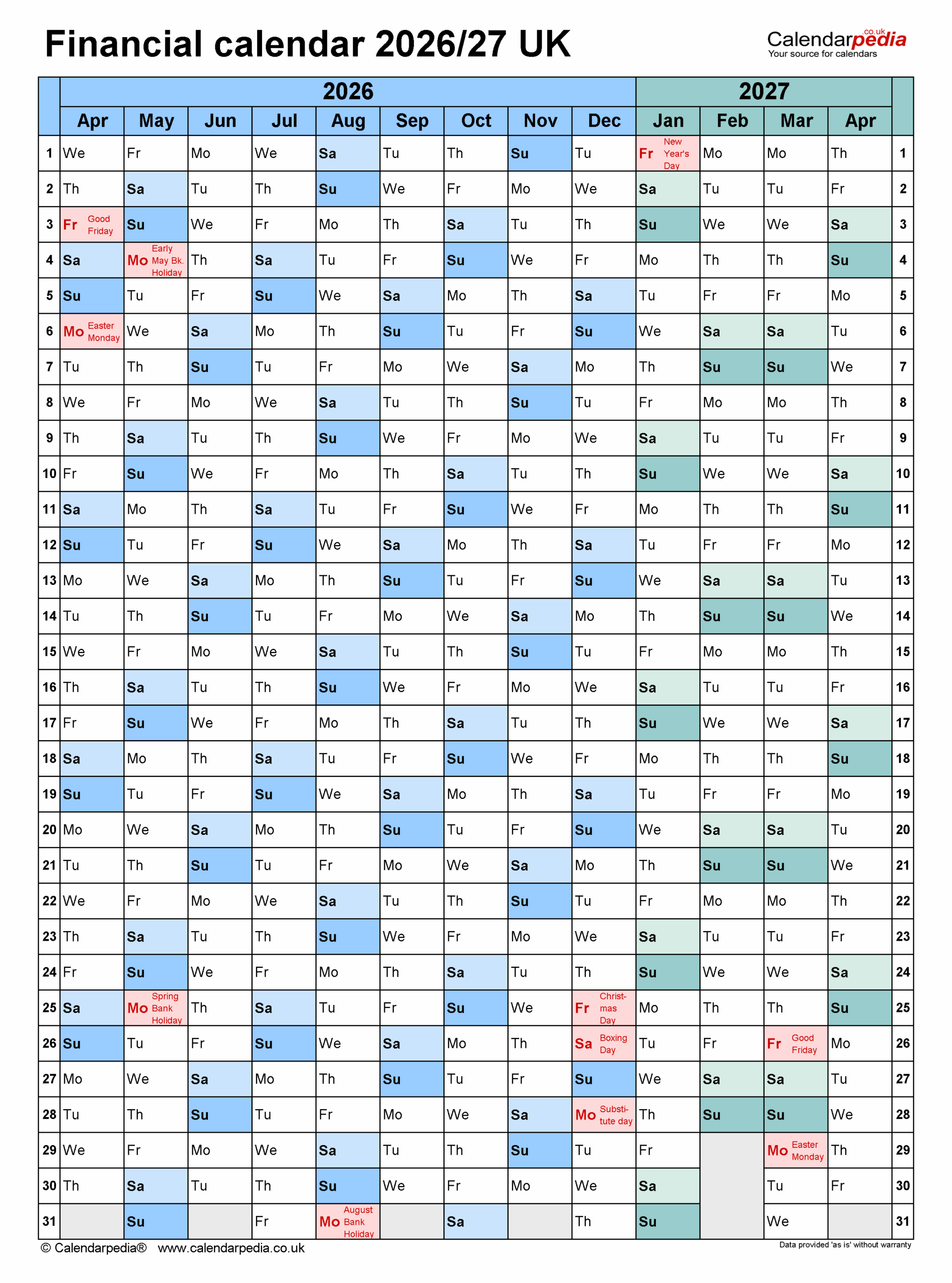 Financial Calendars 2026 27 UK In PDF Format