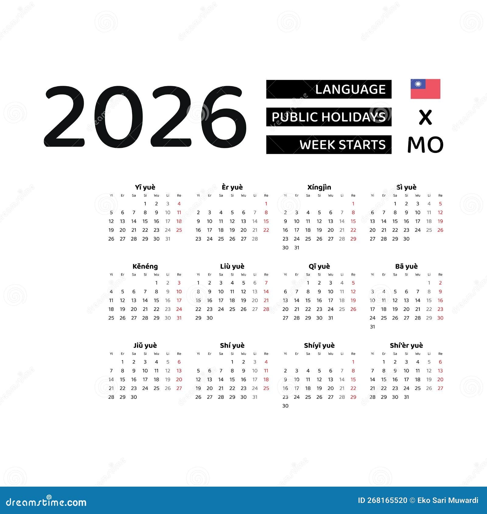 Calendar 2026 Chinese Language With Taiwan Public Holidays Stock