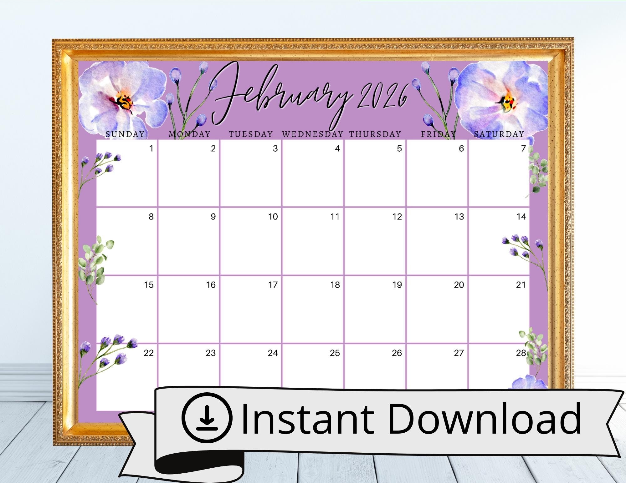 February 2026 Digital Calendar Violets Flowers Planner Editable