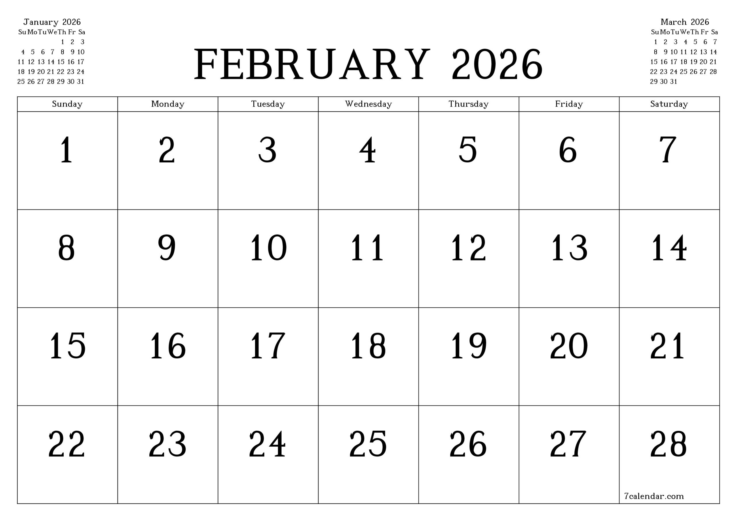 February Calendar 2026 Printable Template 7calendar