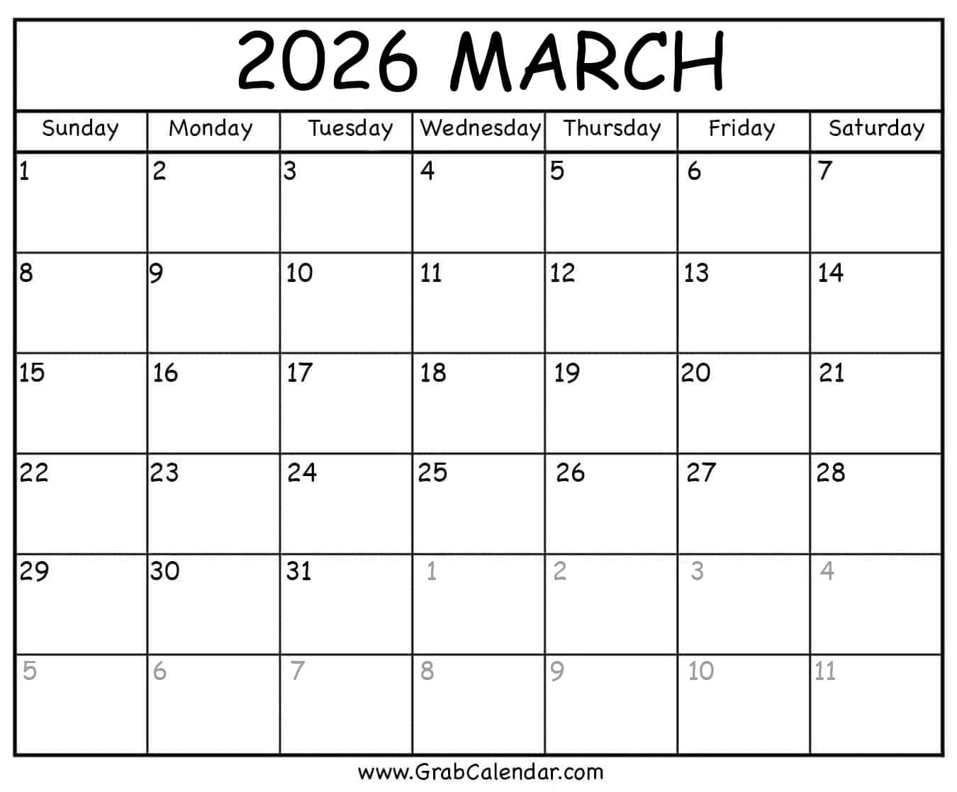 Printable March 2026 Calendar