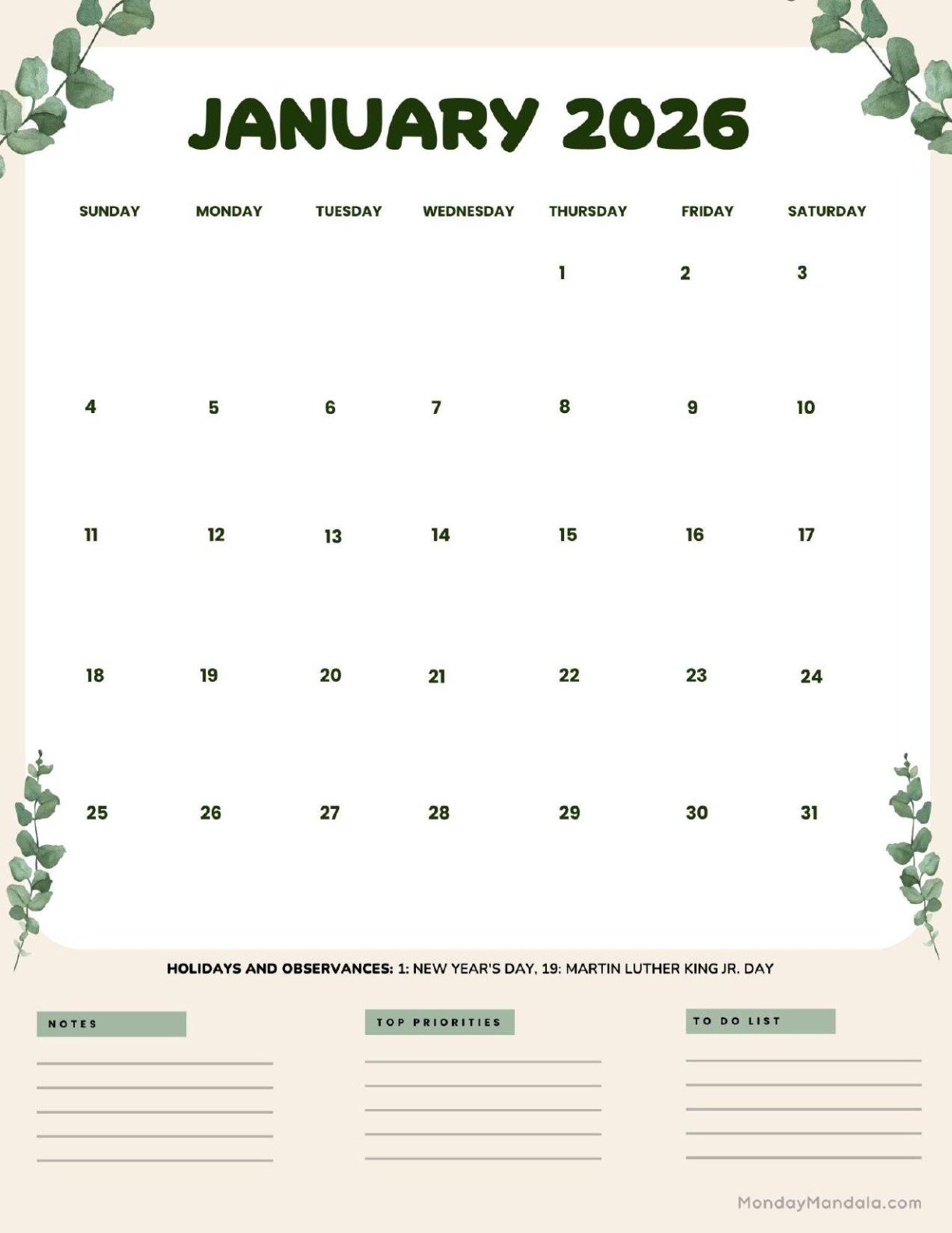 Printable January 2026 Calendar