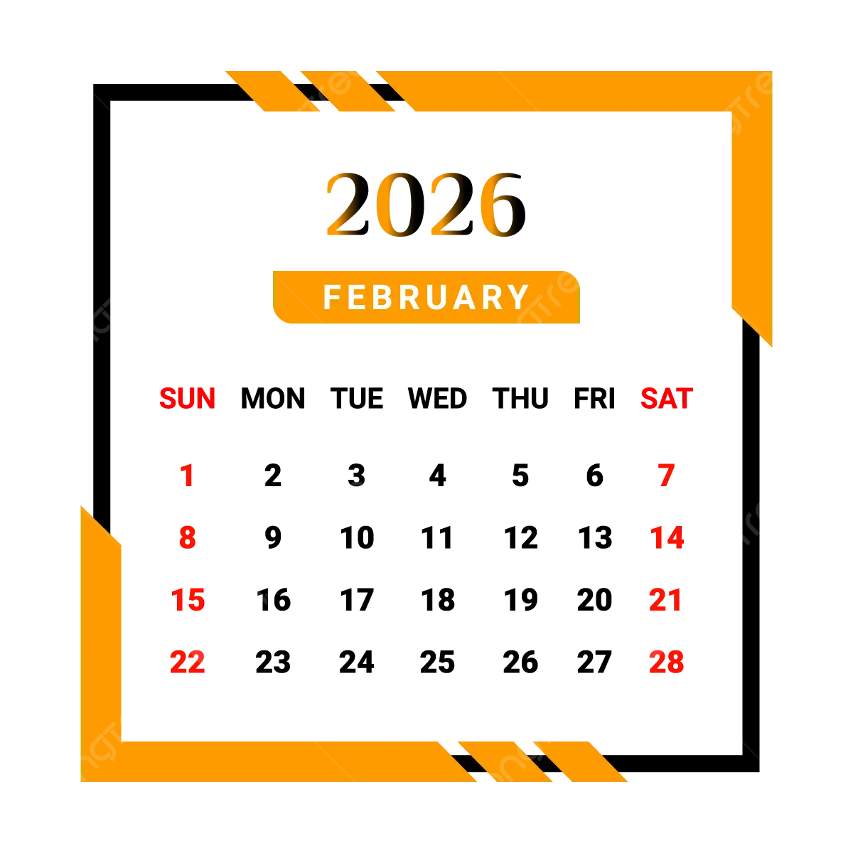 2026 February Month Calendar With Yellow And Black Unique Style Vector Monthly Calendar Calendar February 2026 PNG And Vector With Transparent Background For Free Download