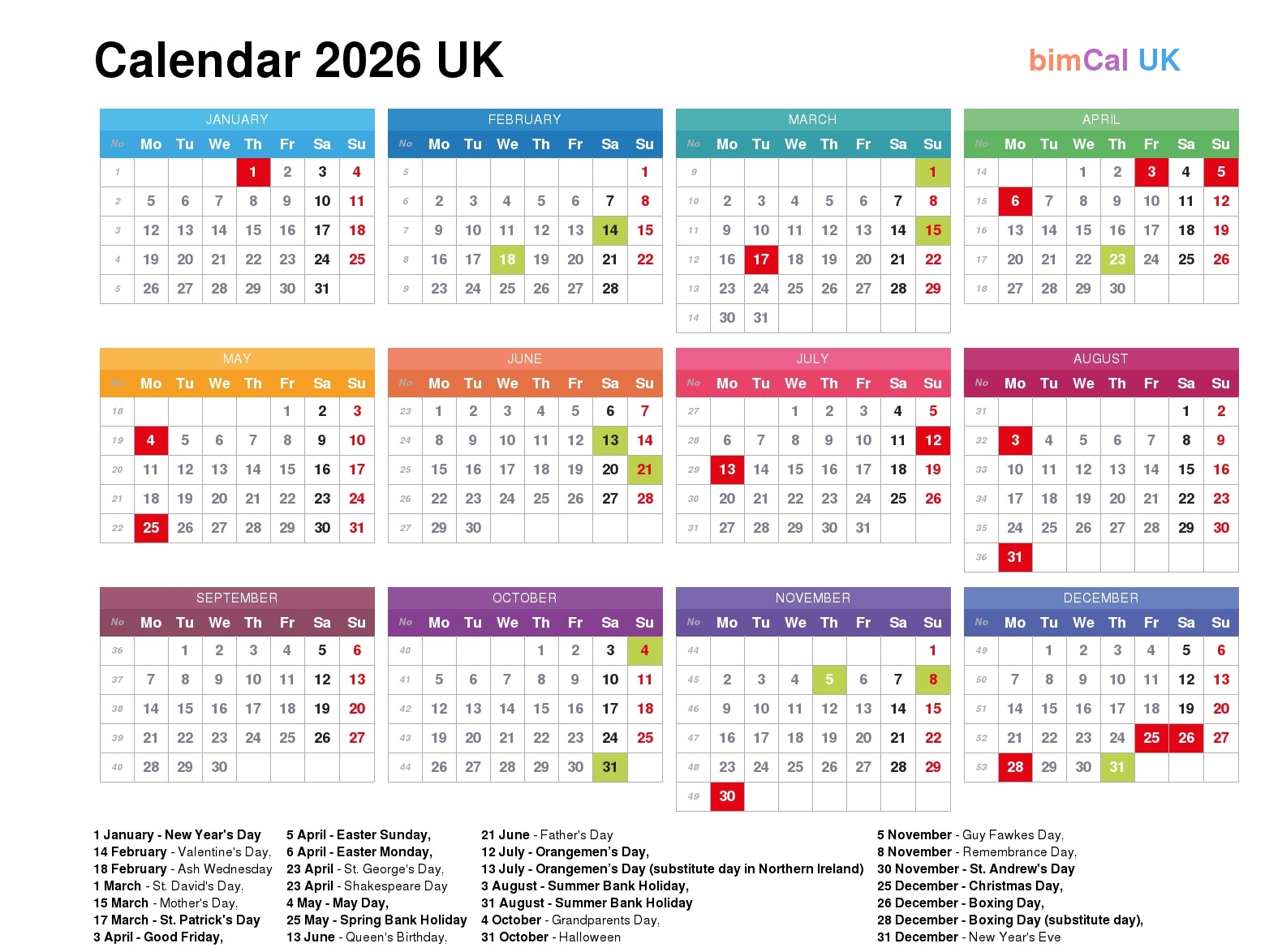 Calendar 2026 UK BimCal uk