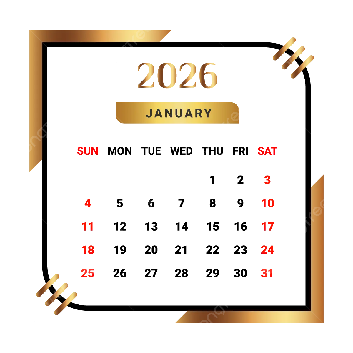 2026 January Month Calendar With Black And Golden Vector Monthly