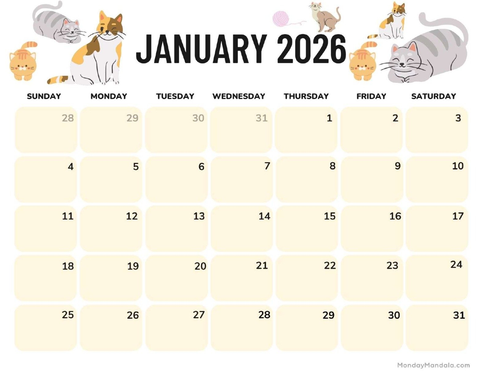 Printable January 2026 Calendar