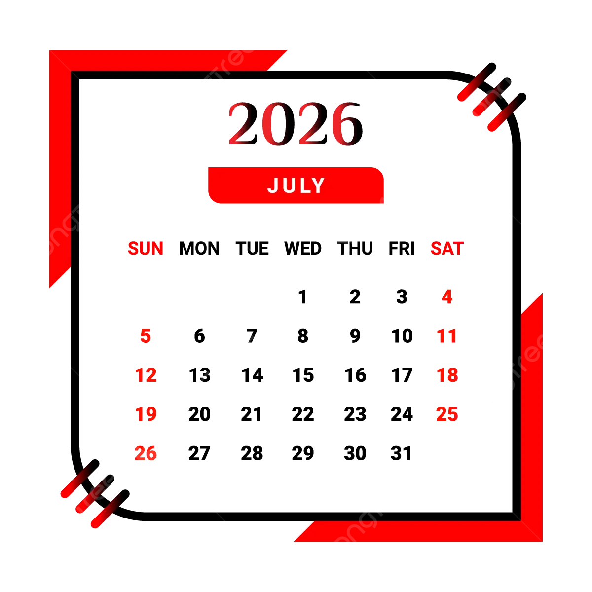 2026 July Month Calendar With Black And Red Vector Monthly Calendar Calendar July 2026 PNG And Vector With Transparent Background For Free Download