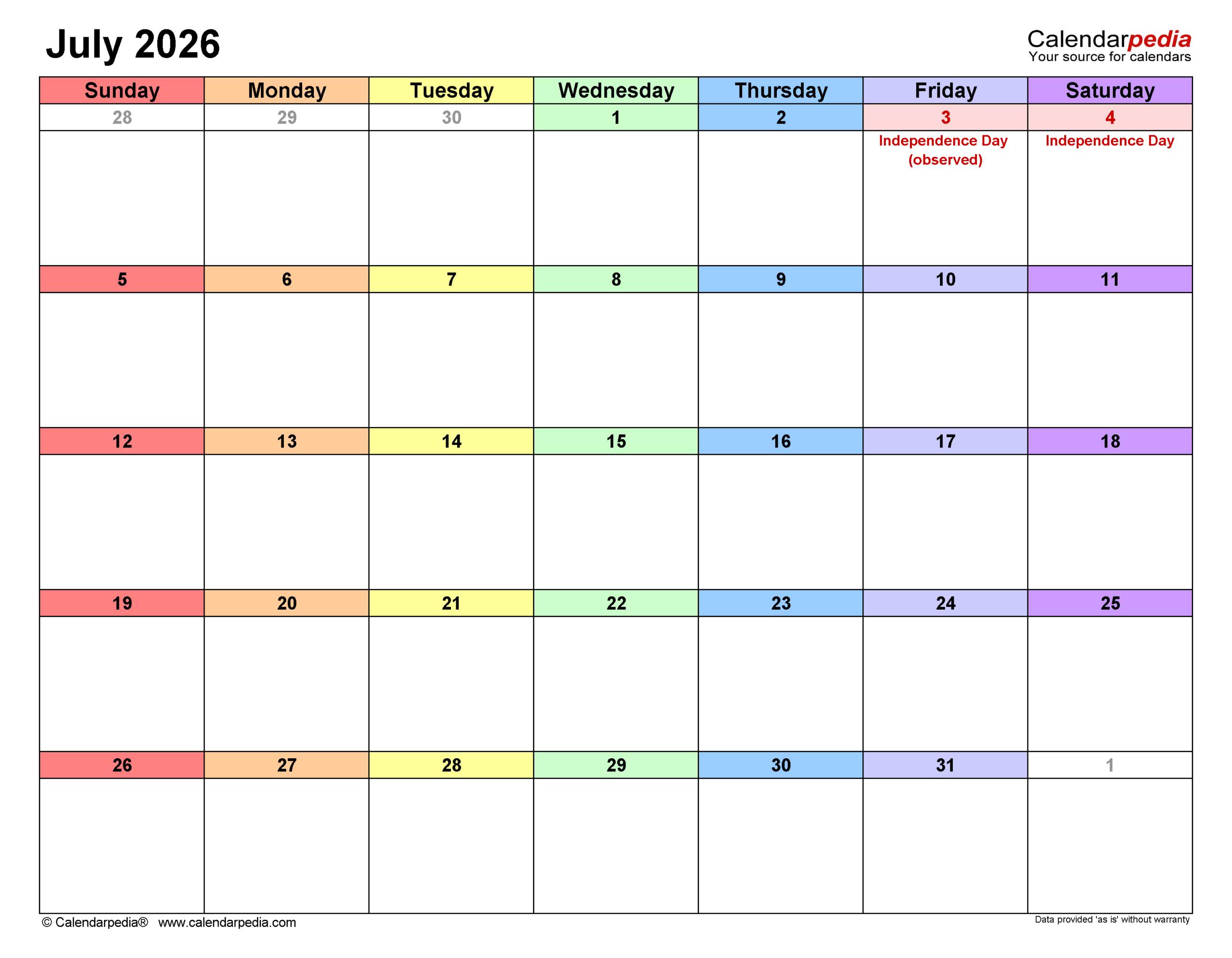 July Calendar 2026 Grid Lines For Holidays And Notes horizontal Free Calendar template
