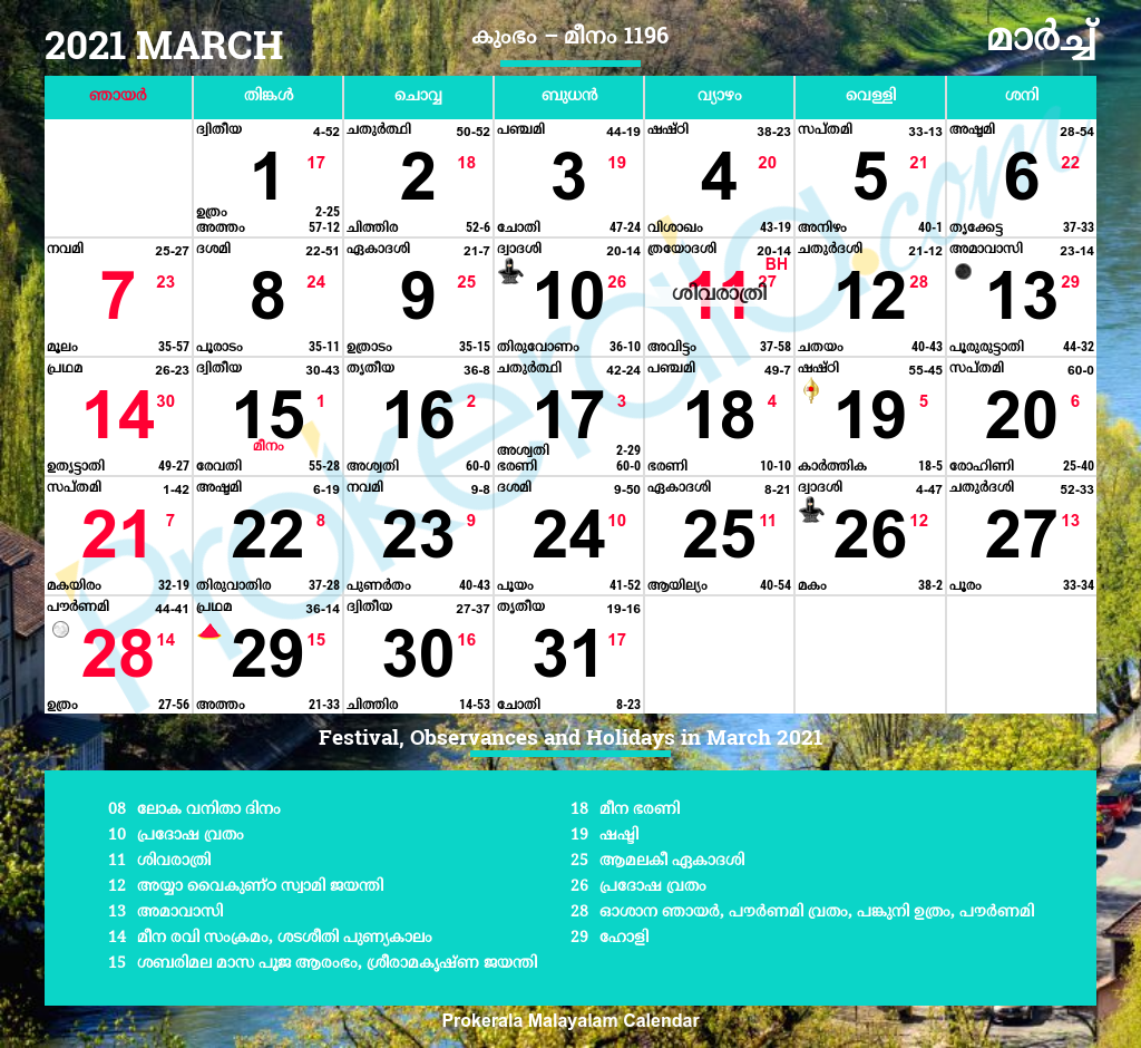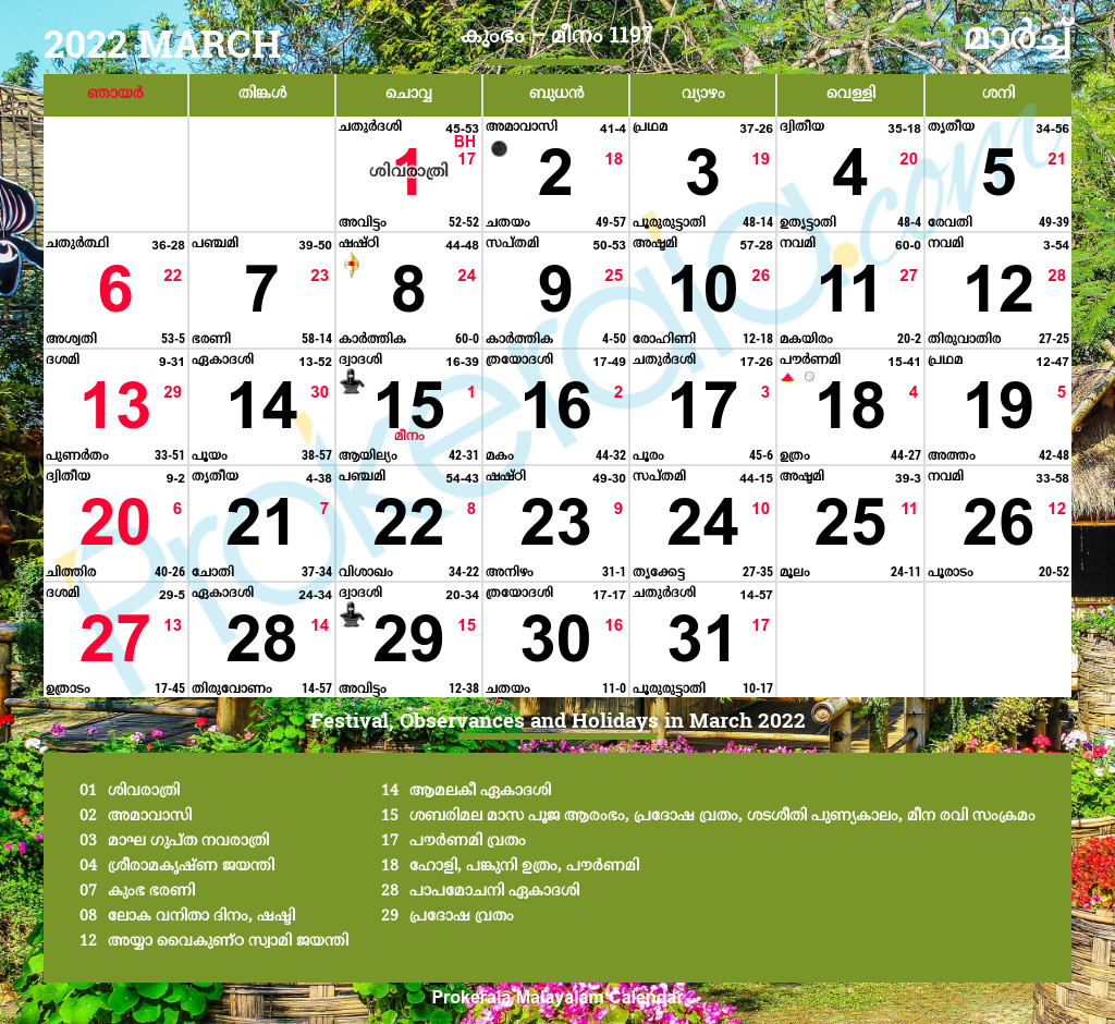 Malayalam Calendar 2022 March