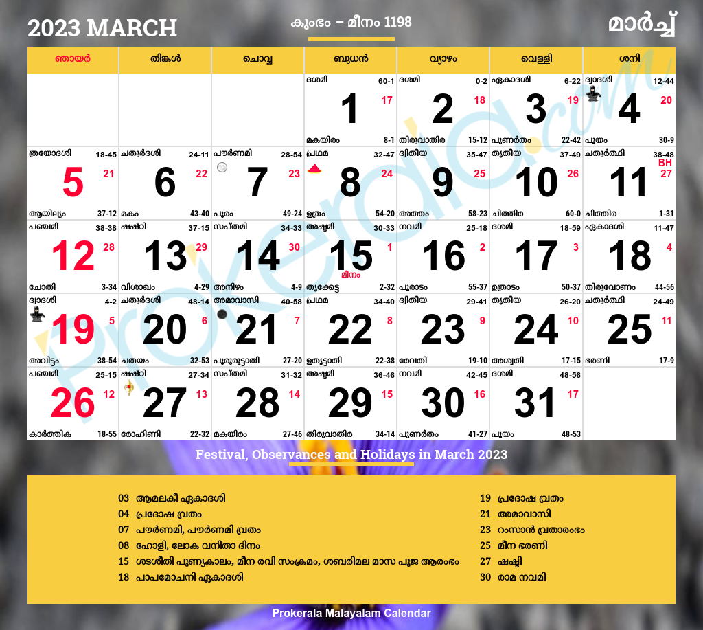 Malayalam Calendar 2023 March
