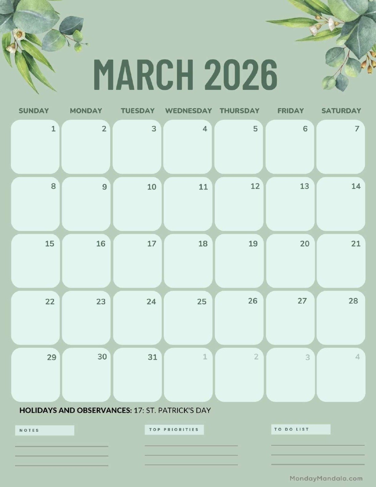 Blank March 2026 Calendar Printable PDF Templates