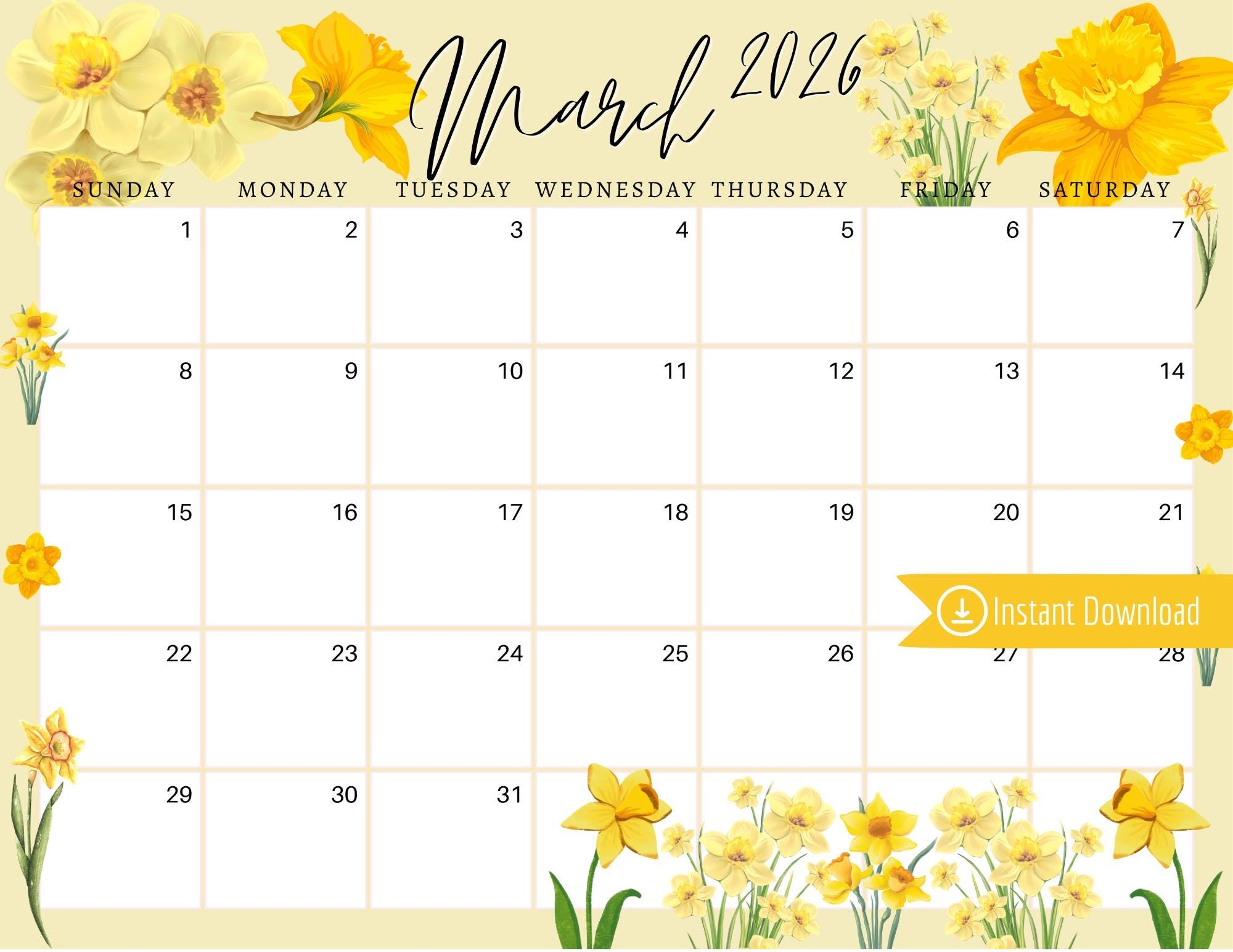 March 2026 Digital Calendar Yellow Daffodils Planner Editable Fillable Printable Calendar For Planning PDF PNG And JPG Download Etsy