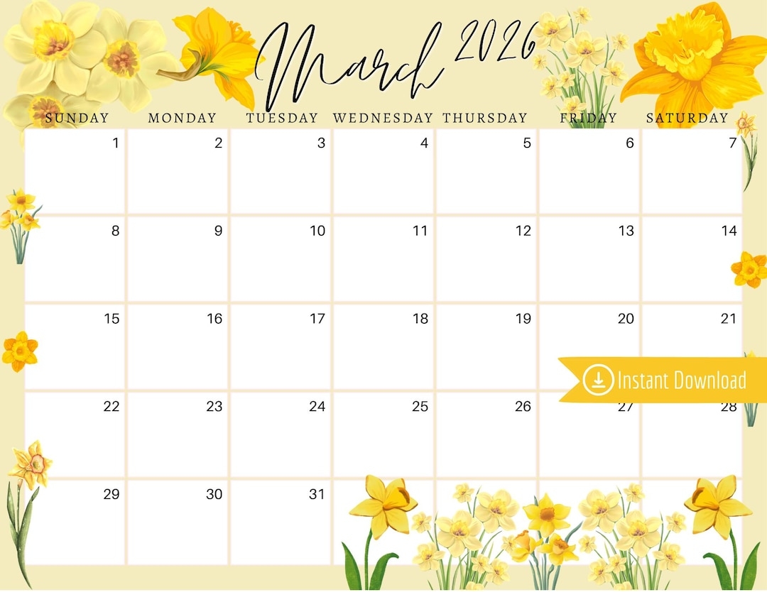 March 2026 Digital Calendar Yellow Daffodils Planner Editable Fillable Printable Calendar For Planning PDF PNG And JPG Download Etsy