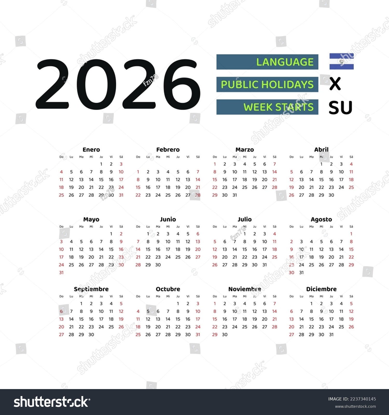 El Salvador Calendar 2026 Week Starts Stock Vector Royalty Free 2237340145 Shutterstock