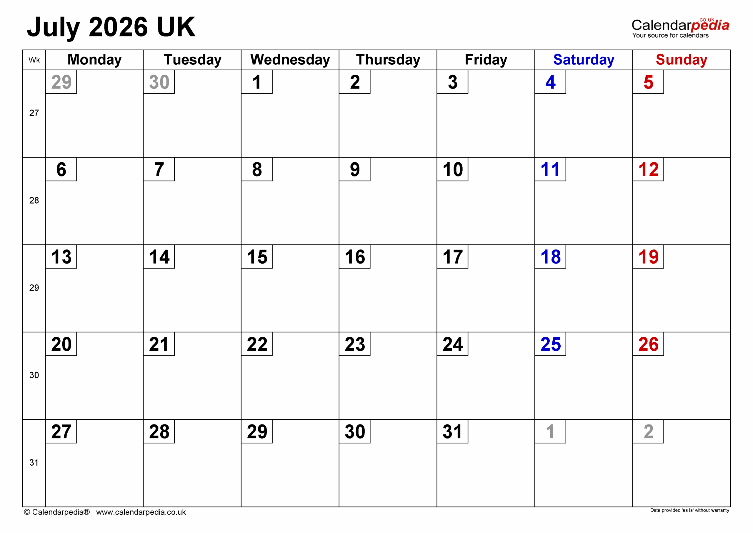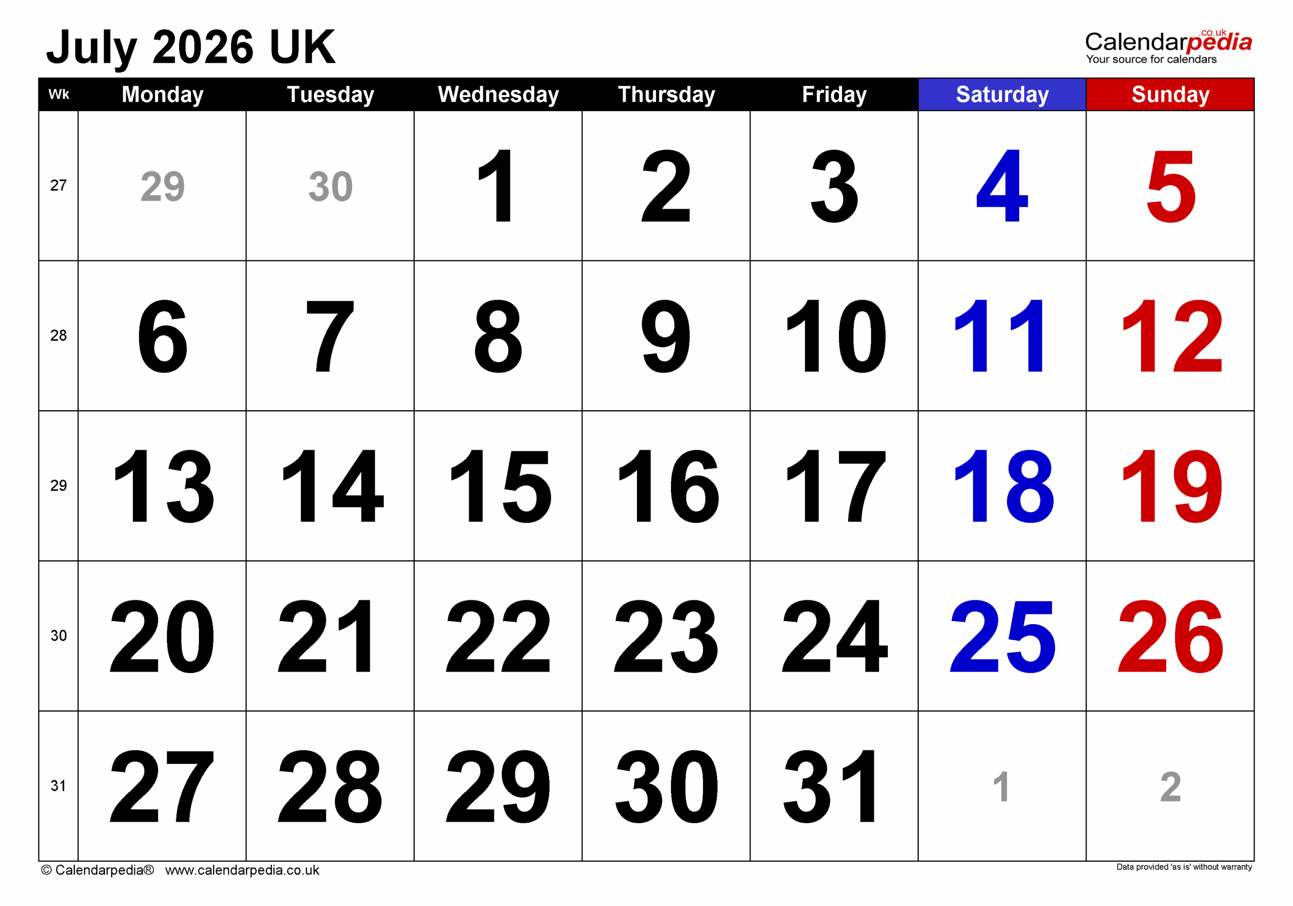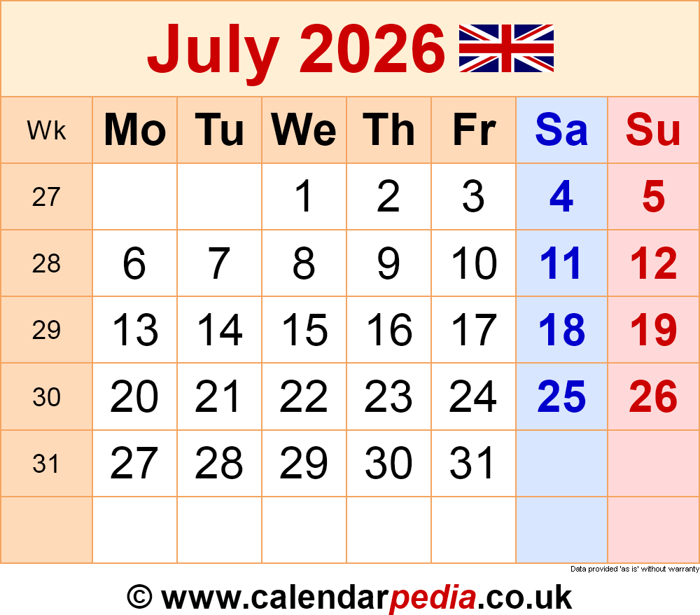 Calendar July 2026 UK With PDF Excel And Word Templates