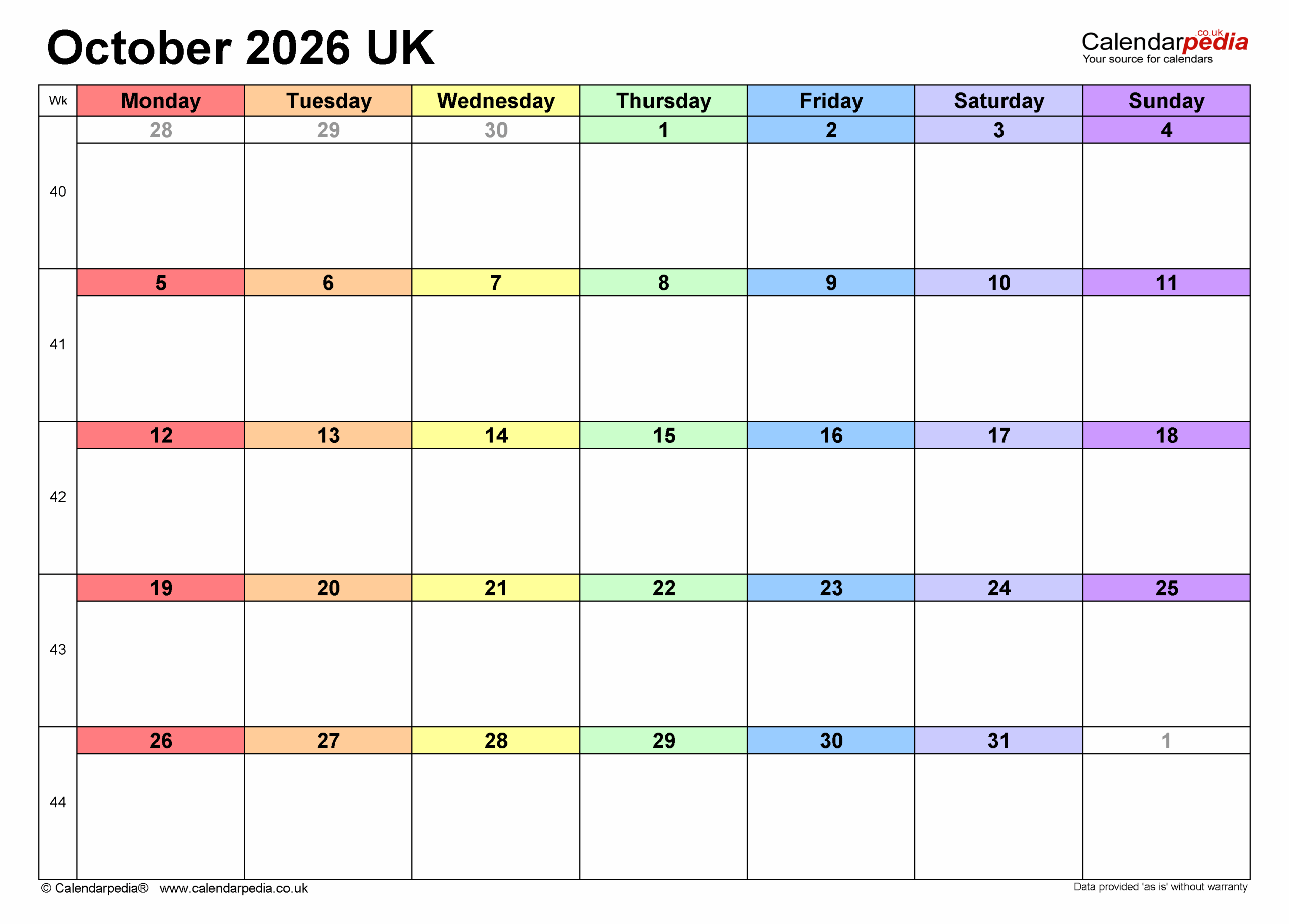 Calendar October 2026 UK With PDF Excel And Word Templates