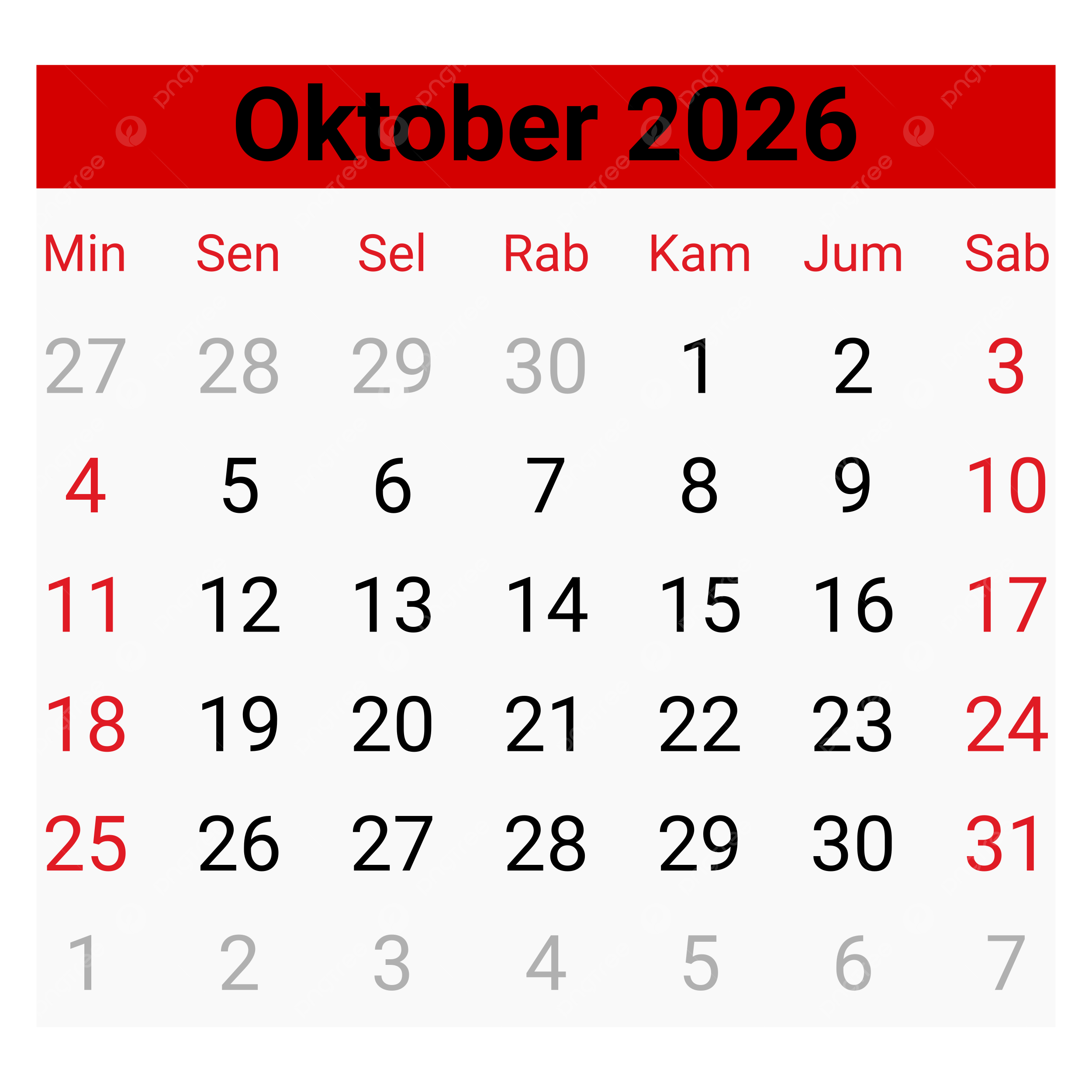 Calendar October 2026 Vector Calendar October 2026 Calendar October 2026 Red Design Calendar October 2026 In Indonesian PNG And Vector With Transparent Background For Free Download