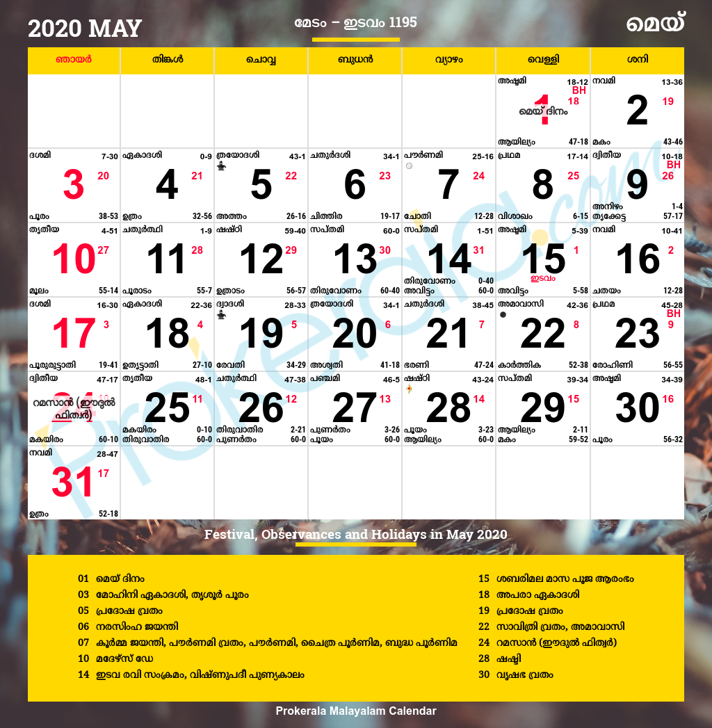 Malayalam Calendar 2020 May