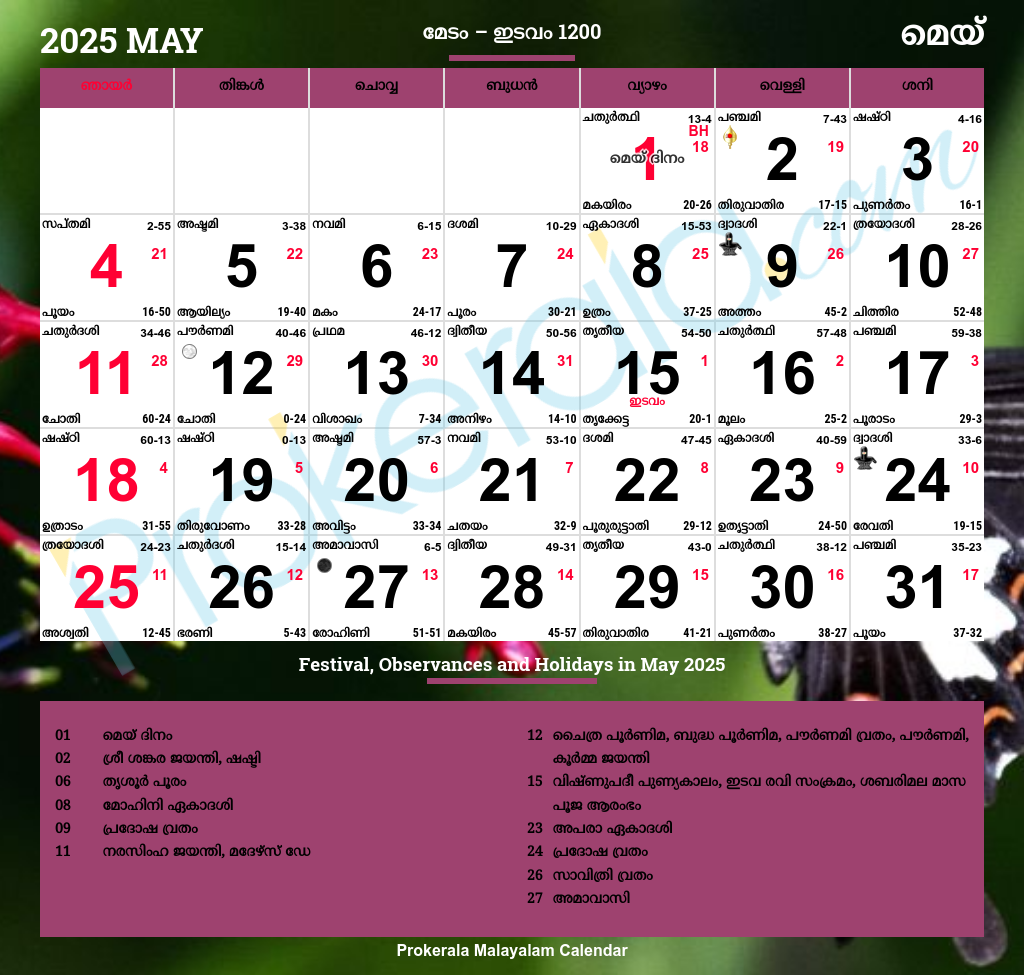 Malayalam Calendar 2025 May