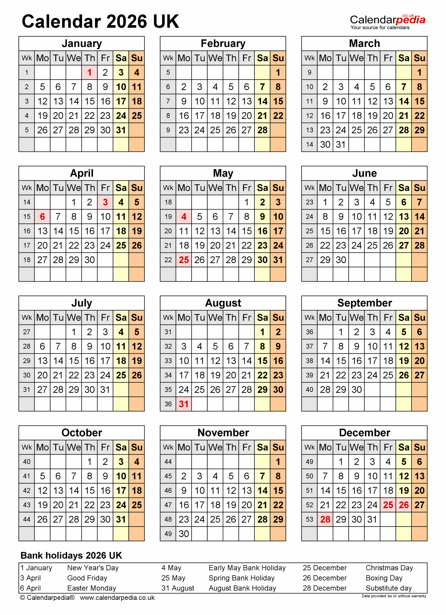 Calendar 2026 UK With Bank Holidays And PDF Excel Word Templates
