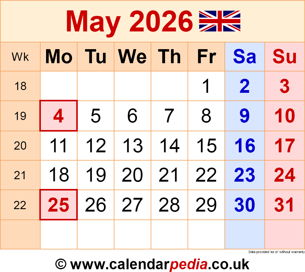Calendar May 2026 UK With PDF Excel And Word Templates