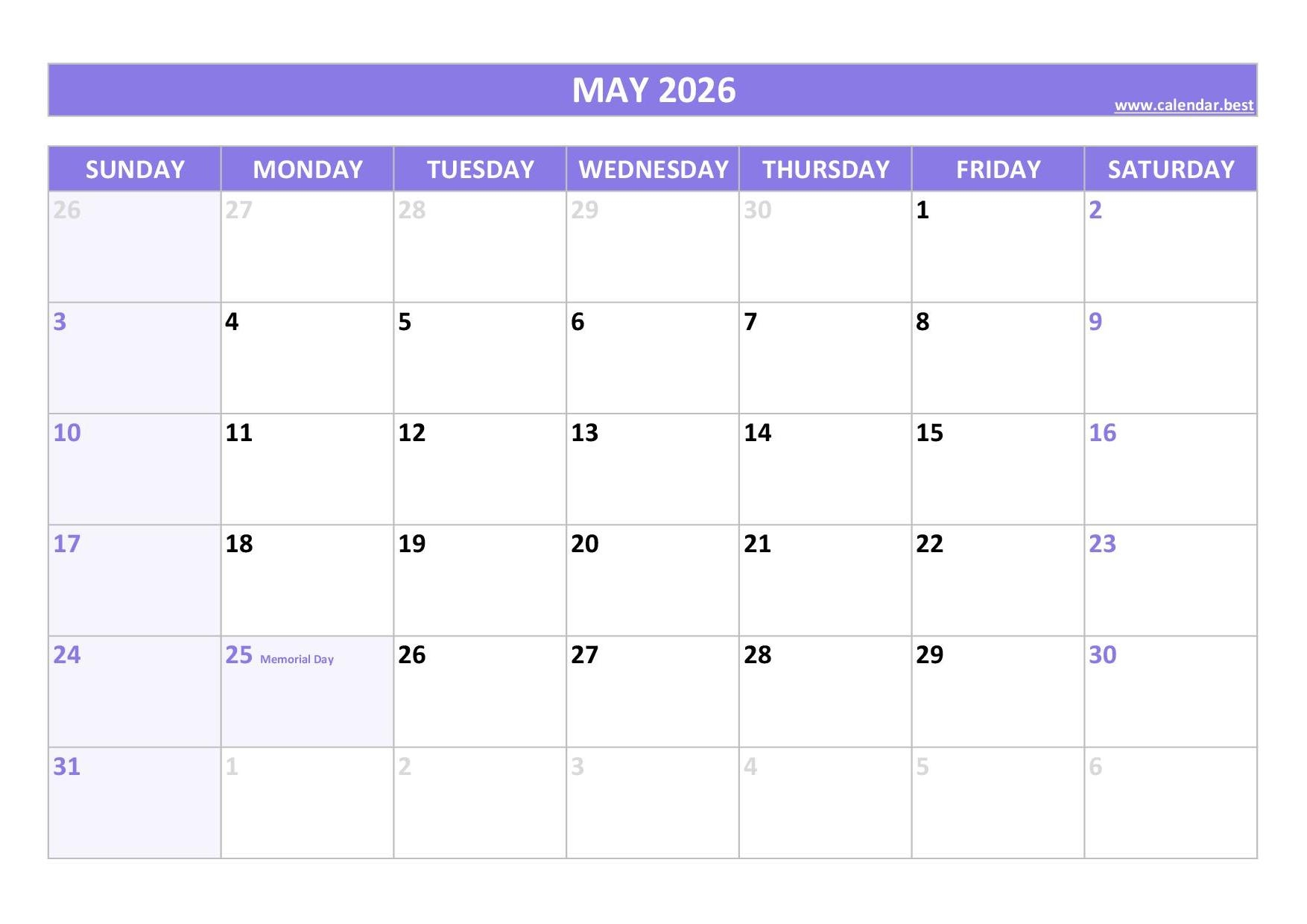 In addition to Memorial Day, May 2026 may also include other holidays such as Mother’s Day, which is a special day to show appreciation for all the moms out there. It’s a time to celebrate and thank them for everything they do.