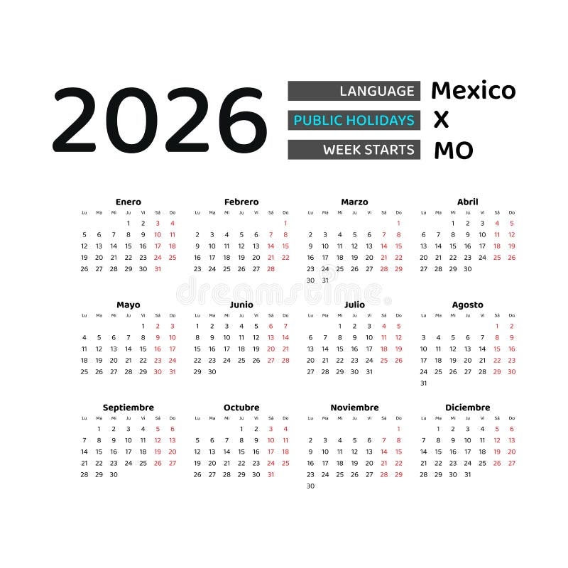 Mexico Calendar 2026 Week Starts From Monday Vector Graphic Design Stock Vector Illustration Of Printing Language 264764992