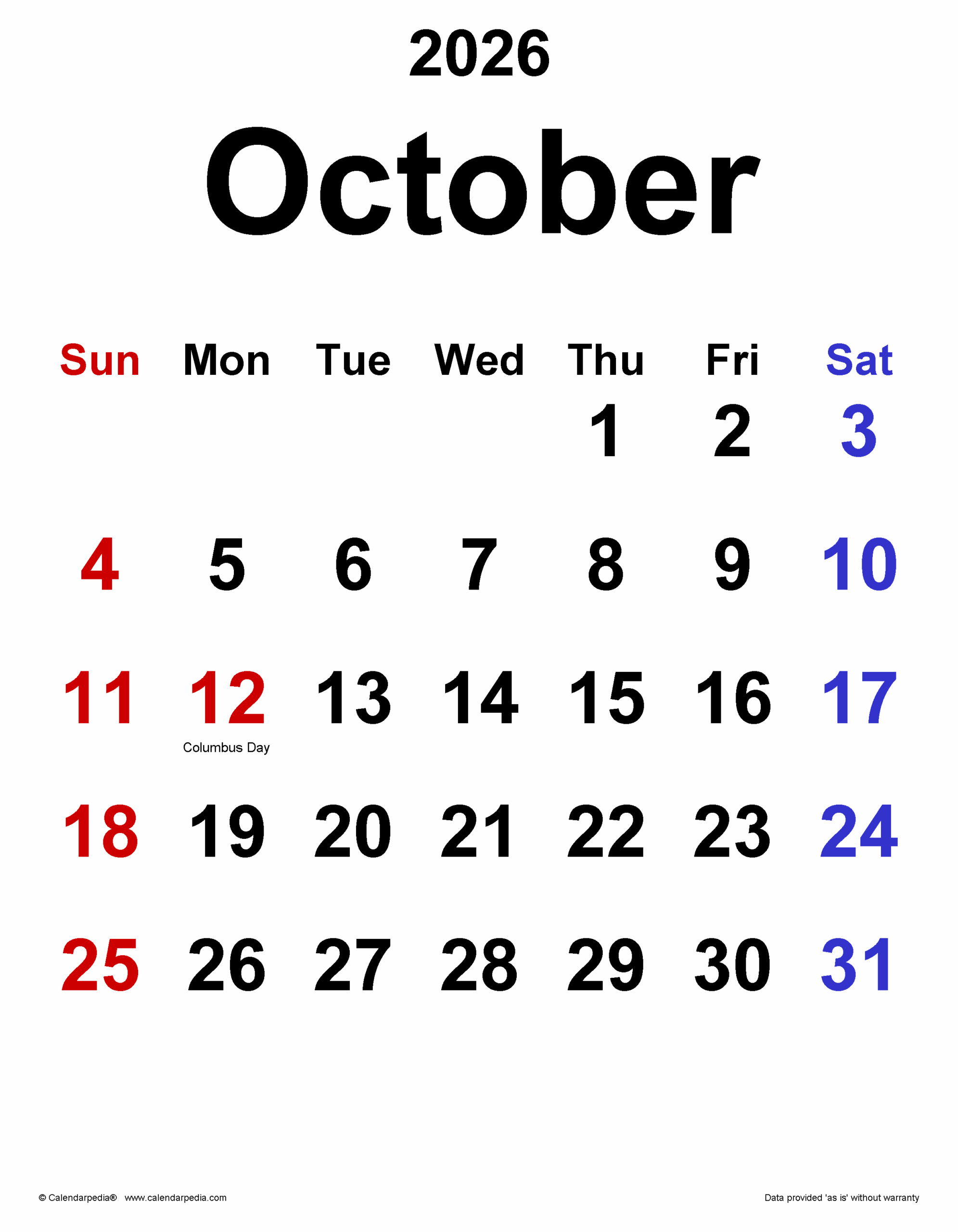 October 2026 Calendar With Extra large Dates WikiDates
