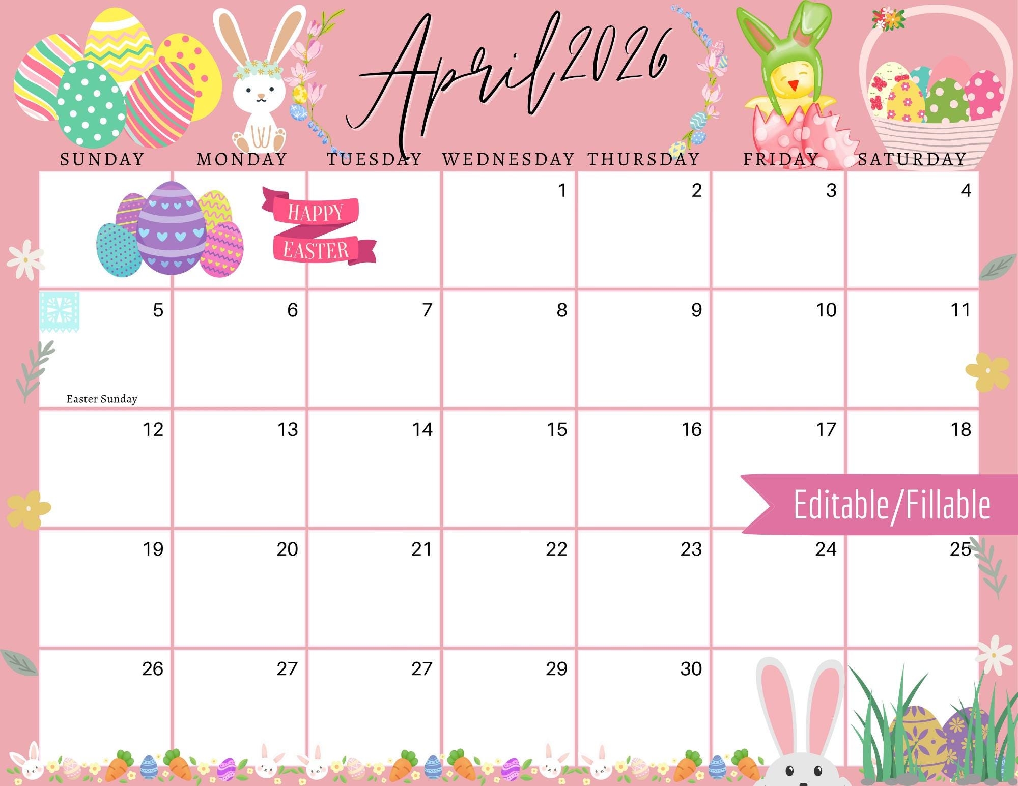 April 2026 Digital Calendar Light Pink Easter Sunday Editable Fillable Printable Calendar For Planning PDF PNG And JPG Download