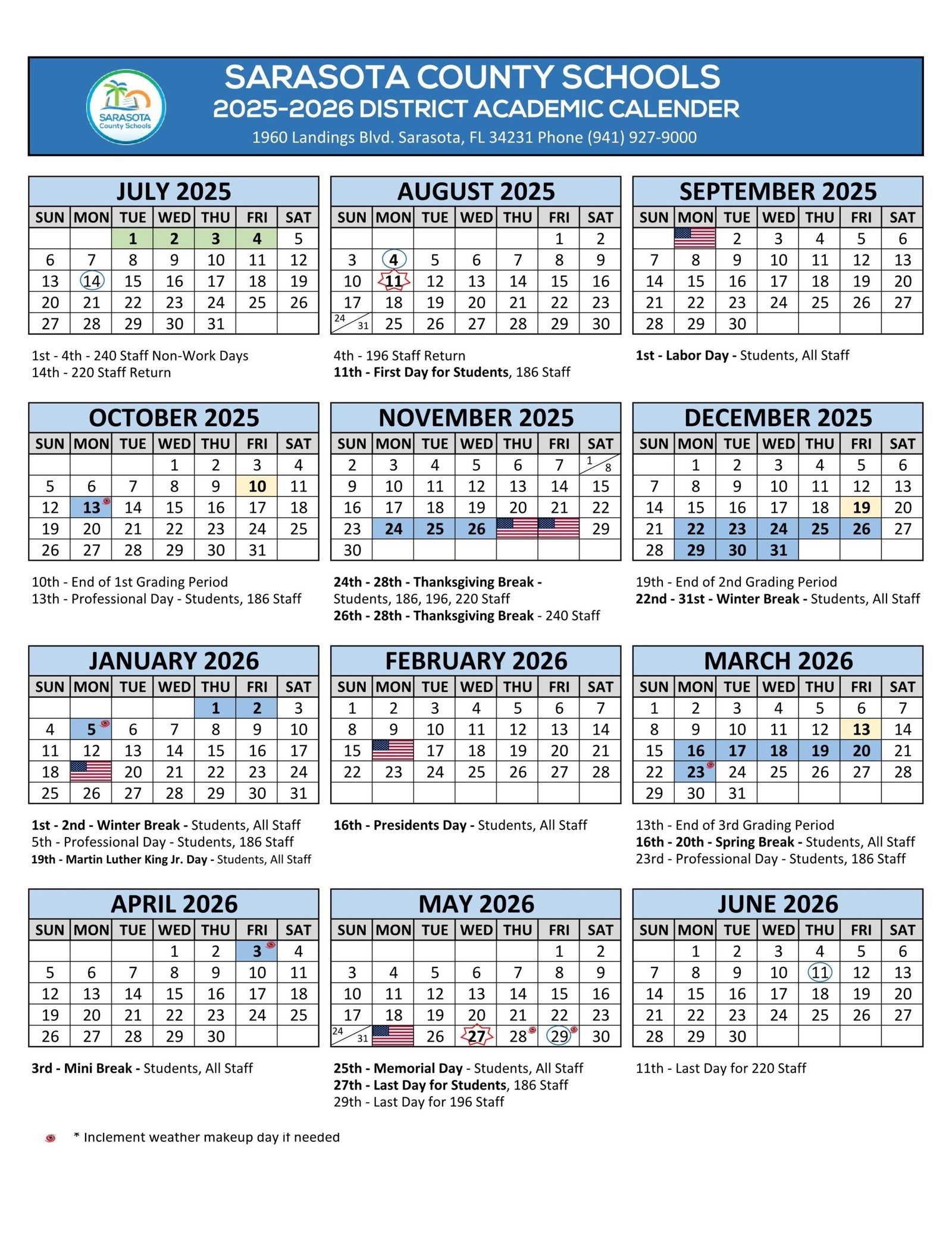 Sarasota County Schools Calendar 25 26 PDF EduCounty